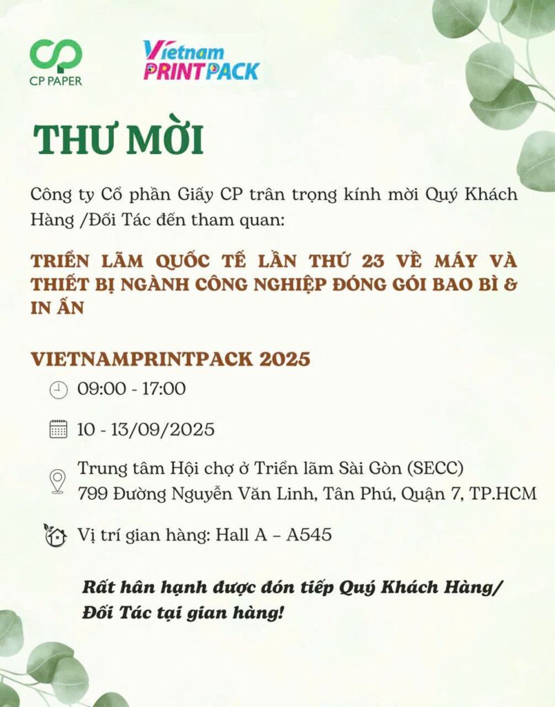 Chúng tôi trân trọng kính mời Quý khách hàng và đối tác đến tham quan gian hàng của CP Paper tại Hall A – A545 từ 9:00 đến 17:00, ngày 10-13 tháng 9 năm 2025 tại Trung tâm Hội chợ và Triển lãm Sài Gòn (SECC).